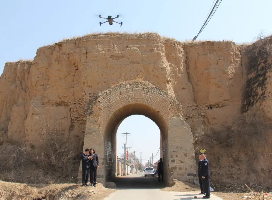 怀安县检察院由主管副检察长带队,采取“检察官+法警+技术人员”为一体的办案模式,在当地长城巡护员的引领下,与县文旅局工作人员共同踏查了西洋河村段明长城保护现状、沿边生态环境和资源保护现状,并运用无人机进行实地勘察、现场拍摄、收集线索、固定证据。经查,现长城保护标志石碑位置距离明长城太近,西洋河村城门(属长城卫城)年久失修,存在裂缝、城砖脱落、人为喷涂广告等问题。